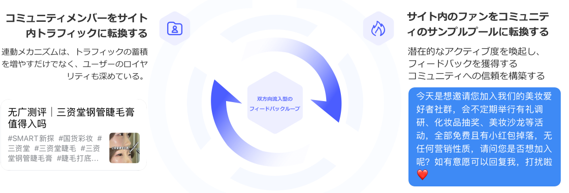 新探小紅書アカウントはプライベートネットワークと双方向引流閉ループを実現している。一方、ソーシャルネットワーク会員は小紅書の双方向コミュニケーションへの参加を通じて、アカウントに真実の外部トラフィックを注入し、ウェイトをアップさせている。また一方、小紅書の新ユーザーがソーシャルネットワークにトランスフォームされ、プライベート会員基礎を拡大している。このような連動仕組みはトラフィックの備蓄を増やしただけでなく、ユーザーのロイヤリティを向上させ、好循環が形成出しされている。この他、不定期にソーシャル内抽選活動を行っている。軽度な敷居の設置(例えばアカウント閉鎖)し、コスメプレゼントと合わせて参加を呼び込み、一回のイベントで40名近くのユーザーをアクティブさせることが出来た。潜在的活躍度の呼び覚ましに成功しているほか、好評をいただいている。毎月小紅書双方向コミュニケーションランキングに基づいて景品を贈呈し、ユーザーの親族や友人のソーシャルネットワーク加入を奨励している。タスク報酬型の仕組みにより、双方向のメリットを実現し、アカウントの基礎トラフィックを安定させている。
