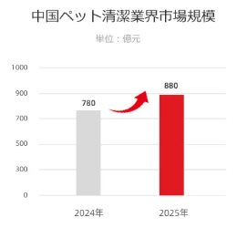 2024年中国ペット清潔業界市場規模は780億元に達した。2025年中国ペット清潔業界市場は成長の基調を辿り続ける見通し。市場規模は880億元に達し、前年比112.8%と伸びる予想である。【TA経済】の清潔レースは安定成長期に着実に入っている。
